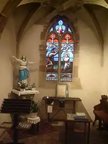 The stained glass windows include works by the 20th century master glass maker Jean-Henri Couturat, second 1925 Prix de Rome.[4]