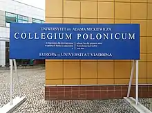 The Collegium Polonicum in Słubice is a joint academic unit of the Adam Mickiewicz University (Polish: Uniwersytet im. Adama Mickiewicza) in Poznań and of the Viadrina European University (German: Europa-Universität Viadrina) in Frankfurt (Oder). Its focus is on interdisciplinary scientific research and teaching on German-Polish, European, intercultural and cross-border issues.[3] Collegium Polonicum is also a branch (Polish: filia) of the Adam Mickiewicz University in Słubice, in whose building this joint unit is physically based.[4] This building had been erected in the years 1992-2001 by the Adam Mickiewicz University for the purpose of joint research and teaching activities with the Viadrina European University. As branch of Adam Mickiewicz University, Collegium Polonicum is one of four such units located outside Poznań and notably housing the Academic Secondary School for General Education in Słubice (Polish: Uniwersyteckie Liceum Ogólnokształcące w Słubicach[5]).
