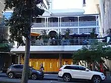 Externally-exposed walls have been painted, while those sheltered by the verandah are unpainted, and show light-coloured splayed brick lintels, stone sills, and darker face brickwork. The building has timber sash windows, French doors opening onto the second level verandahs, tripartite windows facing the street to the first floor level, and flat arches to window heads on second floor level. It sits on a rendered masonry base which has intricate brick and iron ventilators.[1]