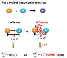 Collision in diluted gas or liquid solution is regulated by diffusion instead of direct collisions, which can be calculated from Fick's laws of diffusion. Theoretical models to calculate the collision frequency in solutions have been proposed by Marian Smoluchowski in a seminal 1916 publication at the infinite time limit,[4] and Jixin Chen in 2022 at a finite-time approximation.[5] A scheme of comparing the rate equations in pure gas and solution is shown in the right figure.