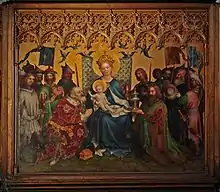 Initially smaller altarpieces such as the Klaren Altar in the Cologne Cathedral from about 1360–70 were created, based on book paintings from around the year 1300.[3] The mid-15th century is the high-point of this school, when Stefan Lochner (active 1442–1451) created the Altar of the City Patrons, which is considered to be the greatest masterpiece of the Cologne School.[4] A third creative period followed, under the influence of Netherlandish painters such as Rogier van der Weyden.[5] Rogier's influence is especially notable in the work of the outstanding representative of this final phase, the anonymous painter known as the Master of the Saint Bartholomew Altarpiece. For example, the latter's large Deposition of Christ resembles the same theme represented in the former's Escorial altarpiece, and the Master's heightened naturalism and emphasis on tear-stained features reflect Rogier's emotionalism.[6]