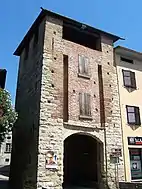 - Porta Rocca, the fortification to the north towards Bergamo and seat of the municipality of Cologno al Serio.[4] The name derives from a fort erected at the end of the thirteenth century along the outer perimeter, of which it is an integral part. Only the lower part of the tower has maintained its original character, while the upper part has been rebuilt over the years. These architectural changes are due to the continuous and repeated damage caused by numerous war events that have marked the history of Cologno. This door also has a coat of arms depicting the Moioli family, who in the seventeenth century owned the castle donated to him by the community of Cologno al Serio in recognition of their contribution to the defence of the town [12]