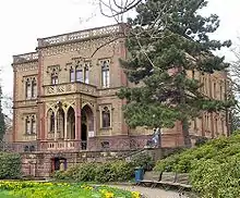 The "Colombischlössle" (Colombi castle) was built between 1859 and 1861 on the terrain of the former bastion Saint Louis of the town fortification of Freiburg, which had been filled in 15 metres and converted to a garden.[1] Duches Maria Antonia Gertrudis von Zea Bermudez y Colombi was the one who commissioned the castle. She wanted the building to be her widow's residence. The plans were made by the Freiburg architect Georg Jakob Schneider, who chose the gothic Tudor-style of the English medieval times as inspiration for the historicist mansion. Additionally, he was inspired by his teacher, Friedrich Eisenlohr, who had rebuilt Ortenberg Castle in this style.[2] It cost about 300,000 Goldmark, 750 per square metre.[1] The historic stairwell, the parquet flooring and a light glass cupola roof, still show the former prosperity of the duchess Maria Antonia Gertrudis de Colombi y de Bode (1809–1863).