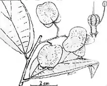 Colona evecta was described from southern Vietnam, it is also found in neighbouring provinces of Cambodia,[4] where the species often survives forest clearing. The tree grows from 6-20m, with radiating pubescent branches and terminal flowers.[3] The bark of young trees is very tough. The leaves are relatively thick, lanceolate, denticulate, glossy on upper sides, with 5–7 mm petioles.[4] The pods have 3-4 wings and are approximately 20–25 mm; the seeds are 6–7 mm.[3]