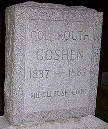 He was originally buried without a tombstone for fear his body would be dug up and put on display. The cemetery is the Cedar Grove Cemetery in Middlebush, New Jersey. His tombstone reads "Col. Routh Goshen, Middlebush Giant, 1837-1889".[22]