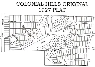 The initial subdivision was titled Colonial Hills and was platted on October 11, 1927, by the Jennings-Lawrence Company, This initial plat consisted of only Riverglen Drive, Southington Avenue, Colonial Avenue, Park Boulevard, Meadoway, Loveman Avenue and Kenbrook Drive. These plans remained shelved until February 18, 1940, when a colonial style model home was opened to the public at 36 East Southington Avenue as part of the 1940 Model Home Show of Columbus. Due to the depression, however, private individuals did not possess the resources to buy new houses and the development remained stalled. The homes that the Federal Government financed in 1942 were much less elaborate than 36 East Southington Avenue.