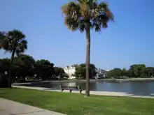 Improvements to the park have been consistent. In 1902, the promenade was improved with a stone pavement. Other improvements were considered, but the lack of security at the site caused officials to question the idea.[9] A dedicated police officer was assigned in 1904.[10] In 1910, palmetto trees were planted along Ashley Ave. and more extensive landscaping was carried out, but officials again noted that vandalism by children playing in the area was causing problems.[11] In 1911, the commissioners who oversaw Colonial Lake announced that new benches would be installed and forty water oaks would be planted.[12] In 1938, the leader of a local club proposed installing a man-made island in the center of the lake, stocking the lake with salt water fish, and promoting it as a destination for visitors; the plan was opposed by residents and did not take place.[13] In 1972, fountains were installed to aerate the lake, but neighbors complained about saltwater overspray, and the fountains often idled due to low water and rusted parts; in 1977, they were removed.[14]