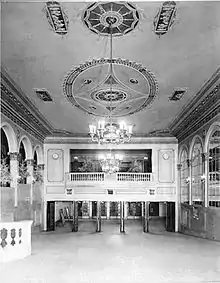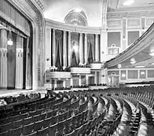 The interior had a three-story auditorium with two balconies. The marble used was rose Tavernell imported from France. The three grand chandeliers lit the long center ramp that swept up to the interior doors. Set in the marble arches of the columns were baskets of flowers, gifts from Wilmer's and Vincent's many clients in the theater world.[2]