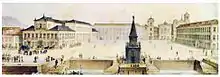 The arrival in Brazil of the French Artistic Mission in 1816 was a crucial point in the diffusion of neoclassical ideals from the capital, encouraged by the need to reorganize Rio's urban plan after the arrival of the Portuguese royal family.[57] The architect coming with the Mission, Grandjean de Montigny, became Professor of Architecture at the Royal School of Sciences, Arts and Crafts, founded by King John IV in 1816. Still during the colonial period, Grandjean designed the Comércio Square in Rio, built between 1819 and 1820, a building with a grandiose dome centered-plan. He also designed the school's main building, inaugurated only in 1826, considered a pure expression of French neoclassicism in its design, with a symmetrical façade and a great centralized portal in Ionic order, the only element that has survived until today, installed in the Botanical Garden of Rio de Janeiro. Although he built little of what he designed, Grandjean's architectural classes trained several architects who played an important role in affirming the neoclassical style throughout the Empire period.