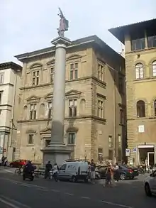 The dedication of this column, erected by Cosimo I de'Medici, changed over time. Cosimo intended first to celebrate his 1537 victory over Siena in the Battle of Montemurlo (others cite the Battle of Marciano). This was apt because he had been here when he was informed of the victory of his troops over the rebellious Pietro Strozzi and his Sienese allies. In 1569, Pope Pius V had granted Cosimo the title of Grand Duke of Tuscany and the dedication was made to Justice with the present inscription.[2]