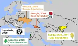 Colour revolution (sometimes coloured revolution)[1] is a term used since around 2004 by worldwide media to describe various anti-regime protest movements and accompanying (attempted or successful) changes of government that took place in post-Soviet Eurasia during the early 21st century—namely countries of the former Soviet Union, and the former Yugoslavia.[2] The term has also been more widely applied to several other revolutions elsewhere, including in the Middle East, the Asia-Pacific region, and South America, dating from the late 1980s to the 2020s. Some observers (such as Justin Raimondo and Michael Lind) have called the events a revolutionary wave, the origins of which can be traced back to the 1986 People Power Revolution (also known as the "Yellow Revolution") in the Philippines.