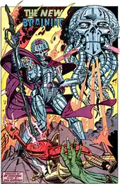 Brainiac returned in the "Panic in the Sky" storyline after seizing control of the mobile planetary fortress Warworld and recruiting assistance from Maxima and the alien warrior Draaga. Discovering a lost and confused Matrix (an artificial life form who at this time operates as Supergirl), Brainiac brainwashes her into becoming his soldier. He clashes with the New Gods and then launches a pre-emptive strike on Earth.[20] Rather than wait for an invasion, Superman gathers a large group of superheroes and allies, one team attacking Warworld directly while the other remains on Earth to counter further attacks.[21][22] Through duplicates of his braincase, Brainiac briefly takes control of some of Earth's heroes, but ultimately he fails. Supergirl and the other heroes are freed from mental control and the villain is rendered catatonic.[23] His vegetative body is taken back to New Genesis for observation.[24]