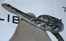 Adult eastern racers can typically vary from 50 to 152 cm (20 to 60 in) in total length (including tail) depending on the subspecies, but a record-sized specimen measured 185.4 cm (73.0 in) in total length.[4][5][6] A typical adult specimen will weigh around 556 g (1.226 lb), with little size difference between the sexes.[7] The patterns vary widely among subspecies. Most are solid-colored as their common names imply: black racers, brown racers, tan racers, blue racers, or green racers. "Runner" is sometimes used instead of "racer" in their common names. All subspecies have a lighter-colored underbelly: white, light tan, or yellow in color. Juveniles are more strikingly patterned, with a middorsal row of dark blotches on a light ground color. The tail is unpatterned. As they grow older, the dorsum darkens and the juvenile pattern gradually disappears.[4]