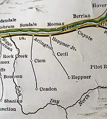 The Columbia River and Oregon Central Railroad built a branch of the Oregon Railroad and Navigation Company (OR&N) from that company's main line at Arlington (on the Columbia River) south to Condon, Oregon, United States. The company was incorporated on August 22, 1903, and finished construction in 1905. A predecessor, Oregon Southern Railway, made surveys and acquired right-of-way, but did not begin construction. Always operated by the OR&N, the property of the Columbia River and Oregon Central Railroad, along with that of the OR&N, was sold to new Union Pacific Railroad (UP) subsidiary Oregon–Washington Railroad and Navigation Company on December 23, 1910.[1] The Condon, Kinzua and Southern Railroad would complete a line from Condon to Kinzua in 1929.