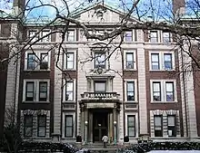Several buildings on the Morningside Heights campus are listed on the National Register of Historic Places. Low Memorial Library, a National Historic Landmark and the centerpiece of the campus, is listed for its architectural significance. Philosophy Hall is listed as the site of the invention of FM radio.[95] Also listed is Pupin Hall, another National Historic Landmark, which houses the physics and astronomy departments. Here the first experiments on the fission of uranium were conducted by Enrico Fermi. The uranium atom was split there ten days after the world's first atom-splitting in Copenhagen, Denmark.[96][97] Other buildings listed include Casa Italiana, the Delta Psi, Alpha Chapter building of St. Anthony Hall, Earl Hall, and the buildings of the affiliated Union Theological Seminary.[98][99][100][101]
