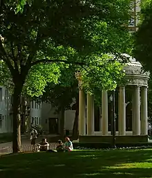"The Steps", alternatively known as "Low Steps" or the "Urban Beach", are a popular meeting area for Columbia students. The term refers to the long series of granite steps leading from the lower part of campus (South Field) to its upper terrace. With a design inspired by the City Beautiful movement, the steps of Low Library provides Columbia University and Barnard College students, faculty, and staff with a comfortable outdoor platform and space for informal gatherings, events, and ceremonies. McKim's classical facade epitomizes late 19th-century new-classical designs, with its columns and portico marking the entrance to an important structure.[105]