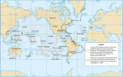Many Europeans of Columbus's day assumed that a single, uninterrupted ocean surrounded Europe, Asia and Africa, although Norse explorers had colonized areas of North America beginning with Greenland c. 986.[1][2] The Norse maintained a presence in North America for hundreds of years, but contacts between their North American settlements and Europe had all but ceased by the early 15th century.[3][4][5]