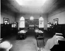 At its opening, the west side of the first floor also held the city's post office, a space including a separate fireproof room. The left or east side housed the city's first public library, a glass-divided room which opened on March 4, 1873. The front section was a reading room, while the back was reserved for books and the librarian's desk.[13] The collection contained 1,500 books.[14] These included 1,200 from the Columbus Athenaeum (1853-1872),[15] 358 from Columbus's high school library, and 33 from its horticultural society.[16] In 1906, the reading room moved to a separate building across from the Ohio Statehouse,[14] and by 1907 to the Main Library, where it remains today.