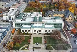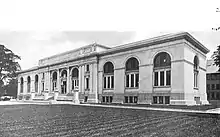 The system's Main Library was built to replace the reading rooms. It was constructed from 1903 to 1906 primarily using funds donated by Andrew Carnegie. Columbus was initially passed over by Carnegie for funds to build a large main library, as it was against his preference for smaller branches accessible to local working class residents.[9] Library director John Pugh traveled to New York City and secured Carnegie's $150,000 donation after bonding over their similar heritage; Carnegie was Scottish and Pugh was Welsh.[10] Carnegie's secretary composed a letter stating that, “not more than one hundred and fifty thousand dollars would be spent upon the main building,” on the condition that the city fund the library for, “at least twenty thousand dollars a year.” The City Council approved the offer and used the initial funds to purchase the $40,000 estate of Thomas Ewing Miller at 96 S. Grant Avenue. With cost of construction exceeding initial estimates, Carnegie agreed to fund an additional $50,000, bringing his full donation to $200,000. A construction contract was awarded to James Westwater & Company, and the building was ready for occupancy in the fall of 1906.[8][11] The building had a cost of $310,000; the city covered the remaining amount and agreed to pay at least $20,000 per year in maintenance and growth; a stipulation of Carnegie's gift.[7] Carnegie's library was dedicated on April 4, 1907.[12]