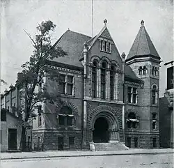 The founding date of the Columbus Public School Library is unknown. The entity was legally established under a state act passed in 1846, though records are lost on when it was created; possibly 1848 or 1847.[7][8] In 1847, amid gradation of the city's public schools, a library for books on education and the theory and practice of teaching was formed early during the administration of the first superintendent, Dr. Asa Dearborn Lord. The city's high school and grammar departments had separate libraries as early as 1853. At the time, the Columbus Metropolitan Library did not exist; it was founded in 1873 in the Columbus City Hall. The Board of Education donated hundreds of books to this reading room, for its opening and in later years. In 1876 the city and school libraries were temporarily united, both governed by a single board of trustees and a single librarian. The combined library began to outgrow its space in City Hall, leading the Board of Education to seek out a new separate home for the school library.[2] As well there was a growing desire, especially over the year in 1889, to have the library under the singular control of the Board of Education. Columbus City Council did not adequately care for or fund the library (having supplied only about a third its total volumes and a third of its 1889 funding), leading the Board of Education to pick up some of their burden. In October 1889, the library committee's chairman proposed an immediate withdrawal of the library to the Front Street School building. The proposal was grouped with other organizational resolutions; a vote was postponed to allow members to read all the resolutions' texts. The chairman's next two attempts were tabled. In February 1890, a new chairman recommended purchasing the Town Street Methodist Episcopal Church and converting it for the school library's use.[1]