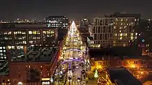 In the 1990s, in an attempt to unify the Short North district and draw customers to the area, a real estate executive proposed the installation of new streetcar arches resembling the historical set. Seventeen were built, lining High Street from I-670 north to just past Fifth Avenue, with a cost of $2.2 million. The first of the new arches were lit on December 4, 2002.[4] These were complemented by similar arches elsewhere in the city, including at the Lennox Town Center shopping complex.[5]