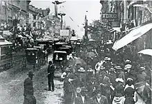 Arches were first used on streets in Columbus in 1888. The Grand Army of the Republic (G.A.R.), a national veterans organization, held its 22nd annual convention in the city that year, bringing about 250,000 people to the city that had held a population of about 90,000. Tent cities were put up around Columbus, so the city erected 25 wooden arches, gas-lit, to support their safety and security at night.[1] The arches spanned High Street for about 7,400 ft (2,300 m), from Union Station south to Livingston Avenue.[2] The event also included a parade of 90,000 veterans down High Street, the largest for Union soldiers since the Civil War. The parade route passed under numerous of these arches on High Street.[1][3]