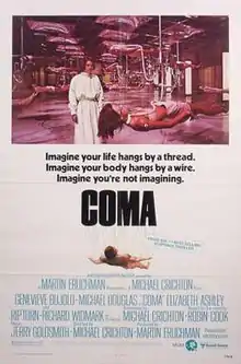 Coma is a 1978 American mystery thriller film based on the 1977 novel of the same name by Robin Cook. The film rights were acquired by director Michael Crichton, and the movie was produced by Martin Erlichmann for Metro-Goldwyn-Mayer. The cast includes Geneviève Bujold, Michael Douglas, Elizabeth Ashley, Richard Widmark, and Rip Torn. Among the actors in smaller roles are Tom Selleck, Lois Chiles, and Ed Harris.