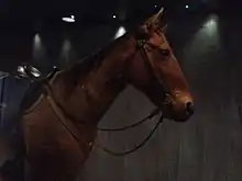 Comanche died of colic on November 7, 1891, believed to be 29 years old at the time.[3] He is one of only four horses in United States history to be given a military funeral with full military honors, the others were Black Jack, Sergeant Reckless and Chief.[4][5][6] His remains were not buried but instead were sent to the University of Kansas and preserved, where the taxidermy mount can still be seen today in the university's Natural History Museum.[7] Comanche was restored by museum conservator Terry Brown in 2005.[8]
