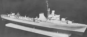 The ships would have been equipped with six 533-millimeter (21 in) torpedo tubes for SI 270 torpedoes in two triple mounts amidships.[3] Possessing a 270-kilogram (595 lb) warhead, the torpedo had ranges of 4,000 meters (4,374 yd) at 46 knots (85 km/h; 53 mph) and 12,000 meters (13,123 yd) at 29 knots (54 km/h; 33 mph).[9] The Italians intended to provide them with a sonar system of an unknown type for anti-submarine work. They would have been fitted with a pair of depth charge throwers and 64 depth charges.[3] The Comandanti Medaglie d'Oros would have been able carry 52 mines as well.[10]
