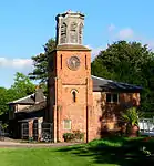 The Elizabethan-style stable block dates from 1837 and was designed by Edward Blore. It forms a quadrangle surrounding a rectangular courtyard and incorporates two cottages and a former carriage house. It has stone dressings and features lancet windows, square lead-roofed turrets and an octagonal-flued chimneystack. The arched main entrance is flanked by narrow octagonal turrets topped with spirelets.[25][26][34][56] A ruined icehouse dating from the 18th or 19th century stands near the stables. It consists of a barrel-vaulted passage leading to a chamber with a domed roof.[34][57] Both buildings are listed at grade II.[56][57]
