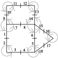 Corresponding combinatorial map (D, φ, α). Darts are represented by numbered arrows, two darts linked by φ are drawn consecutively (example φ(1) = 3) and two darts linked by α are drawn parallel and in reverse orientation (example α(1) = 2).