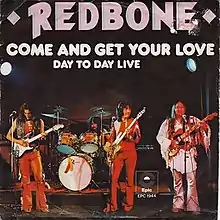 "Come and Get Your Love" is a song by American rock band Redbone.[3] The song was originally released as a promo track under the name "Hail" and was later featured on their fifth album, Wovoka (1973), under its current name. The song was released as the album's first single the following year. Written and produced by band members Pat and Lolly Vegas, it is one of the band's most successful singles. It made them the first Native American band to reach the top five on the Billboard Hot 100, reaching number five.[4] The song later appeared on many "greatest hits" albums released by the band, as well as on numerous compilation albums of the 1970s. A music video was released in 2020.[5]