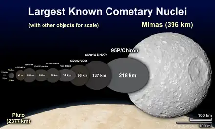 Most cometary nuclei are thought to be no more than about 16 kilometers (10 miles) across.[48] The largest comets that have come inside the orbit of Saturn are 95P/Chiron (≈200 km), C/2002 VQ94 (LINEAR) (≈100 km), Comet of 1729 (≈100 km), Hale–Bopp (≈60 km), 29P (≈60 km), 109P/Swift–Tuttle (≈26 km), and 28P/Neujmin (≈21 km).
