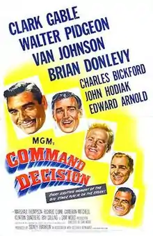 Command Decision is a 1949 war film released by Metro-Goldwyn-Mayer starring Clark Gable, Walter Pidgeon, Van Johnson, and Brian Donlevy, and directed by Sam Wood, based on the 1948 stage play of the same name written by William Wister Haines, which he based on his best-selling 1947 novel. The screenplay for the film was written by George Froeschel and William R. Laidlaw.[N 1] Haines' play ran on Broadway for almost a year beginning in October 1947.[2]