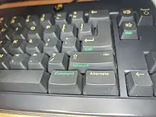 The Command key (sometimes abbreviated as Cmd key), , formerly also known as the Apple key or open Apple key, is a modifier key present on Apple keyboards. The Command key's purpose is to allow the user to enter keyboard commands in applications and in the system. An "extended" Macintosh keyboard—the most common type—has two command keys, one on each side of the space bar; some compact keyboards have one only on the left.