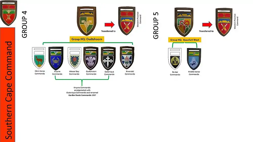 Under the SADF, Commando units were grouped regionally under Commands: (Please note: This was not a wholly static structure and units could move occasionally between Groups, the diagrams below depict the structure from the late 1980s)