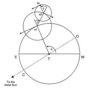 The Moon itself, represented by the point M in the diagram, moves uniformly from west to east around the circumference of the second epicycle so that the period of the angle γ is half a synodic month.[9] Copernicus states that whenever the point e1 lies on the line joining the Earth to the centre of its orbit (represented by the dotted line OTC in the diagram, of which only the point T here lies in the Moon's orbital plane), the Moon M will lie precisely between e1 and e2. However, this can occur only once every 19 years, when this line coincides with the line of nodes WTE. At other times it does not lie in the moon's orbital plane and the point e1 cannot therefore pass through it. In general, then, while the Moon will be close to conjunction or opposition to the Sun whenever it lies precisely between e1 and e2, these events will not be precisely simultaneous.
