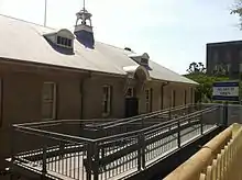 The only entry point into the penal settlement was via the adjacent wharf on the Brisbane River. Initially known as the King's Wharf or Jetty, it was constructed by 1827 when the boat crew's hut and boat builder's shed were first occupied. A crane was constructed on the end of the wharf in order to transfer goods from the arriving ships to the shore.[19] The main roadway into the settlement was up along the steep river bank following the present day alignment of Queens Wharf Road.[20] A pedestrian path developed along the slope from the wharf to the ridge of present-day William Street passing to the north-west of the Commissariat Store, through what is now Miller Park.[21] A retaining wall along the Queens Wharf Road frontage of Miller Park had been constructed by convicts before 1831. A wall, with an opening leading to stairs in a position corresponding to this path, appears in an 1838 plan.[22][23] A pencil sketch by Henry Boucher Bowerman dated c. 1835 shows a wall here with an arched opening a few metres up the hill from the store yard wall.[24][1]