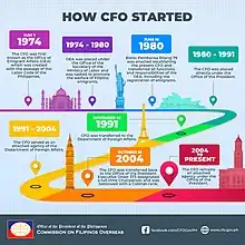 The evolution of the Commission on Filipinos Overseas can be traced with the passage of Presidential Decree No. 442 (Labor Code of the Philippines), which was enacted in 1974, creating the Office of Emigrant Affairs, along with the Overseas Employment Development Board (now POEA) among other offices created.[2]