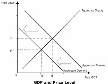 Similar to the reasoning in the previous section, as seen in Figure 4, a decrease in GDP leads to deflation. This can have negative or positive effects, depending on whether the nation's currency was overvalued or undervalued. Deflation can either be positive or negative in the long run as suggested by the effects section of the deflation article.