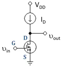 In electronics, a common-source amplifier is one of three basic single-stage field-effect transistor (FET) amplifier topologies, typically used as a voltage or transconductance amplifier. The easiest way to tell if a FET is common source, common drain, or common gate is to examine where the signal enters and leaves. The remaining terminal is what is known as "common". In this example, the signal enters the gate, and exits the drain. The only terminal remaining is the source. This is a common-source FET circuit. The analogous bipolar junction transistor circuit may be viewed as a transconductance amplifier or as a voltage amplifier. (See classification of amplifiers). As a transconductance amplifier, the input voltage is seen as modulating the current going to the load. As a voltage amplifier, input voltage modulates the current flowing through the FET, changing the voltage across the output resistance according to Ohm's law. However, the FET device's output resistance typically is not high enough for a reasonable transconductance amplifier (ideally infinite), nor low enough for a decent voltage amplifier (ideally zero). Another major drawback is the amplifier's limited high-frequency response. Therefore, in practice the output often is routed through either a voltage follower (common-drain or CD stage), or a current follower (common-gate or CG stage), to obtain more favorable output and frequency characteristics. The CS–CG combination is called a cascode amplifier.