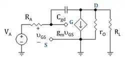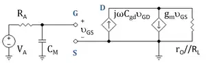 Examination of the output side of the circuit in Figure 2 enables the frequency dependence of the gain vD / vG to be found, providing a check that the low-frequency evaluation of the Miller capacitance is adequate for frequencies f even larger than f3 dB. (See article on pole splitting to see how the output side of the circuit is handled.)