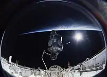 The PCBM-equipped module is maneuvered into the capture envelope by a tele-robotically operated Remote Manipulator System (RMS). Two different RMSs have been used to berth modules: the 6-joint Shuttle RMS (SRMS, or "Canadarm") and the 7-joint Space Station RMS (SSRMS, "Canadarm2").