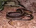 The common garter snake (Thamnophis sirtalis) is a species of snake in the subfamily Natricinae of the family Colubridae. The species is indigenous to North America and found widely across the continent. There are several recognized subspecies. Most common garter snakes have a pattern of yellow stripes on a black, brown or green background, and their average total length (including tail) is about 55 cm (22 in), with a maximum total length of about 137 cm (54 in).[2][3] The average body mass is 150 g (5.3 oz).[4] The common garter snake is the state reptile of Massachusetts.[5]