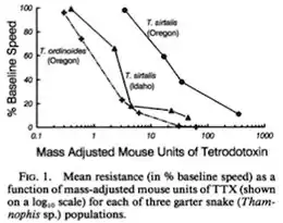 The common garter snake uses toxicity for both offense and defense. On the offensive side, the snake's venom can be toxic to some of its smaller prey, such as mice and other rodents.[7] On the defensive side, the snake uses its resistance to toxicity to provide an important antipredator capability.[8] A study on the evolutionary development of resistance of tetrodotoxin compared two populations of Thamnophis and then tested inside a population of T. sirtalis. Those that were exposed to and lived in the same environment as the newts (Taricha granulosa) or rough-skinned newt, that produce tetrodotoxin when eaten were more immune to the toxin (see figure).[8]It seems that the two species were in a evolutionary arms race.