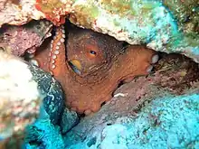 Primarily, the octopus situates itself in a shelter where a minimal amount of its body is presented to the external water.[18] When it does move, most of the time it is along the ocean or sea floor, in which case the underside of the octopus is still obscured.[18] This crawling increases metabolic demands greatly, requiring they increase their oxygen intake by roughly 2.4 times the amount required for a resting octopus.[19] This increased demand is met by an increase in the stroke volume of the octopus' heart.[20]