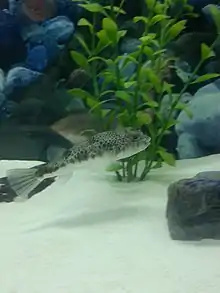 The fish is sandy to whitish in colour, with small brown spots over most of the back and upper sides, and brown bars and blotches beneath.[5] It has a maximum length of 14 cm.[4] It is similar in appearance to the smooth toadfish, but has smaller spots and more prominent spines in the skin.[5]