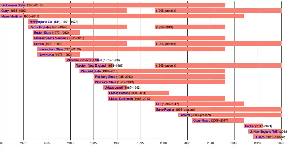 After the 2012 season, the NEFC split, with the seven Massachusetts state institutions and Plymouth State playing in the MASCAC for football.[2] The conference's automatic bid to the NCAA Division III playoffs continued to be held by the eight remaining members: Curry, Endicott, Maine Maritime, MIT, Nichols, Salve Regina, Coast Guard, and Western New England. In the 12 seasons the NEFC hosted a championship game between its two division winners, these remaining eight members accounted for 16 of the 24 championship game participants and 8 of 12 conference champions.[3]