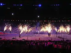 Various elements frame the opening ceremony of the Commonwealth Games. This ceremony takes place before the events have occurred. The ceremony typically starts with the hoisting of the host country's flag and a performance of its national anthem. The flag of the Commonwealth Games Federation, flag of the last hosting nation and the next hosting nation are also hosted during the opening ceremony. The host nation then presents artistic displays of music, singing, dance and theatre representative of its culture. The artistic presentations have grown in scale and complexity as successive hosts attempt to provide a ceremony that outlasts its predecessor's in terms of memorability. The opening ceremony of the Delhi Games reportedly cost $70 million, with much of the cost incurred in the artistic segment.[70]