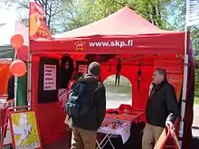 The SKP has made electoral coalitions with other small parties, especially the Communist Workers Party (KTP). Communist League members were on SKP lists before they in 2006 founded the Workers Party of Finland (STP). The SKP condemned the STP for scattering communist forces.[10] The parties have made some limited electoral cooperation since. The Left Alliance has never been interested in coalitions with the communists,[11] although the parties have had coalitions in few municipalities.